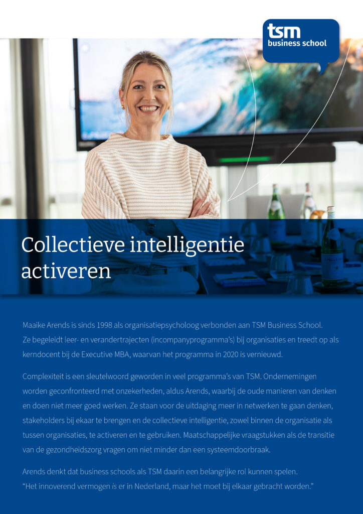 Het belang van denken in netwerken en het benutten van de kracht van het collectief is iets wat Maaike Arends steeds benadrukt. “Daar waar oude structuren en patronen niet meer het antwoord zijn op de uitdagingen die zich aandienen (denk aan de crises in gezondheid, economie en samenleving), hebben we wellicht ‘systeemdoorbraken’ nodig om verder te komen. Oplossingen kunnen niet binnen het oude systeem gevonden worden en het nieuwe systeem vraagt om een gezamenlijk ontwerp door de betrokken partijen. Voor systeemtransities is een lange adem nodig inclusief ruimte (tijd en capaciteit) om het pad te bewandelen van uitzoomen (echt anders denken en doen) en inzoomen (nieuwe inzichten zo vertalen dat je er in de praktijk ook iets mee kunt). Die tijd en ruimte is er in de programma’s van TSM. We hebben in de MBA een groep gehad die met nieuwe concepten kwam voor de zorg, waarin de taken en functies op een heel andere manier zijn verdeeld. Het enthousiasme dat ontstaat bij betrokkenen is bij zulke projecten altijd heel groot. Ze zeggen wel eens: waarom kan het hier wel en bij ons niet? Maar dat is niet zo vreemd. Zoals gezegd: er is ruimte, er is tijd en het programma brengt de kennis en expertise samen van mensen van binnen en buiten een organisatie. Het optimaal benutten van individuele competenties en het stimuleren van de kracht van het collectief, daarin kan een business school als TSM het verschil maken.”